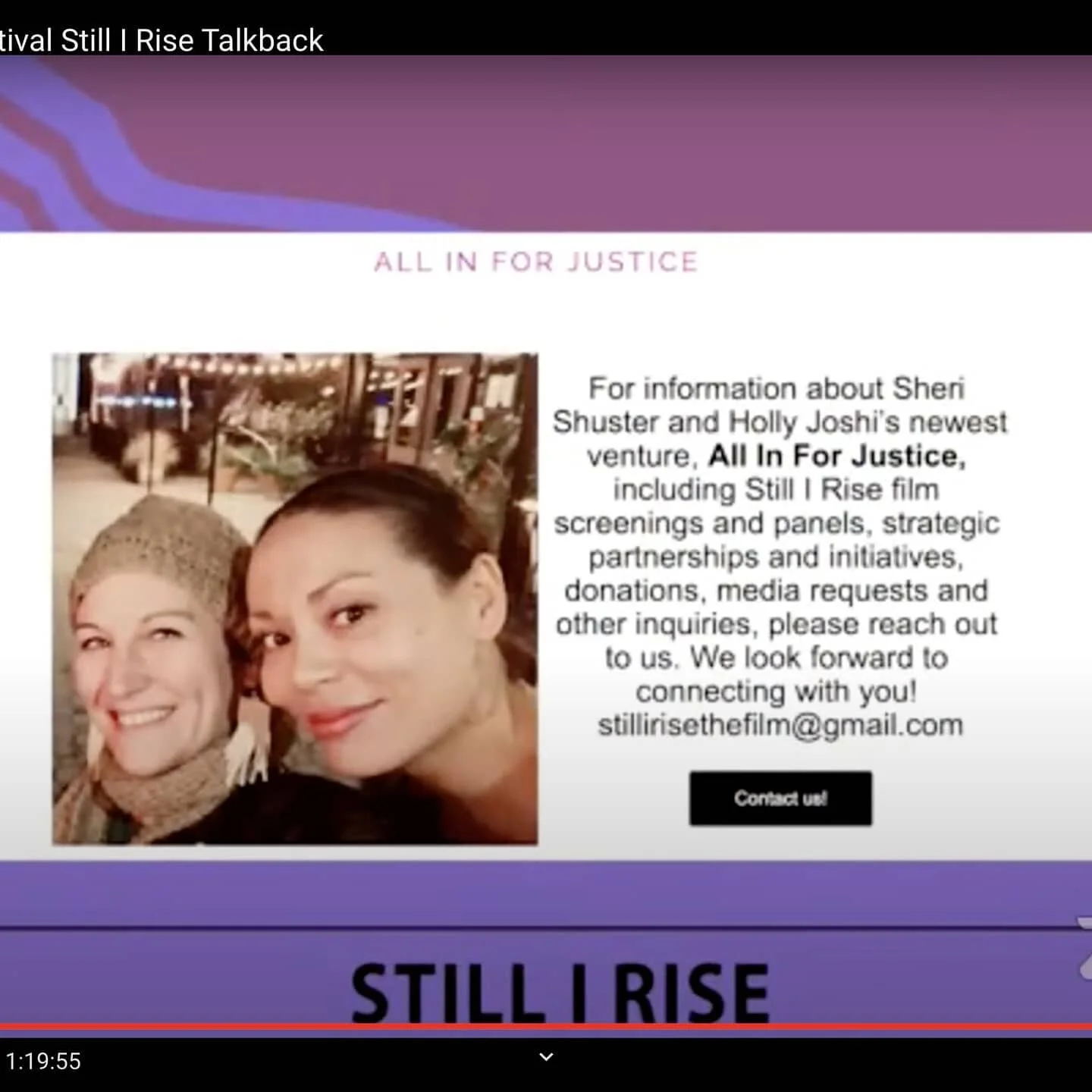 Excited to learn more about Sheri Shuster’s and Holly Joshi’s dynamic new venture, ALL IN FOR JUSTICE, including Still I Rise (2020) film screenings and panels, strategic partnerships and initiatives, donations, media requests and other inquiries? We sincerely welcome you to reach out! Our vision centers healing, public love and narrative change. We look forward to connecting with you! stillirisethefilm@gmail.com